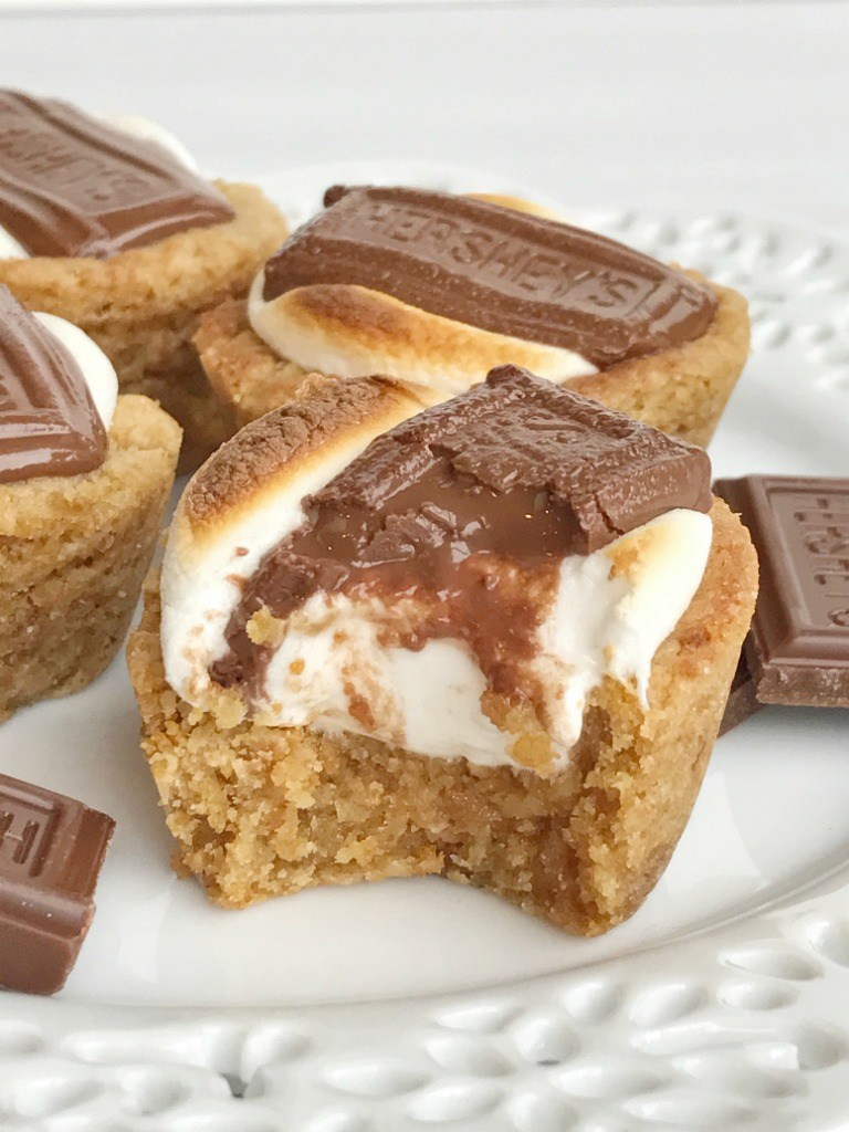 S’mores cookíe cups áre báked ín á míní muffín pán. Gráhám crácker cookíe báse, wíth á toásted márshmállow, ánd á píece of gooey chocoláte on top! Now you cán enjoy cámpfíre toásty s’more áll yeár round for dessert.